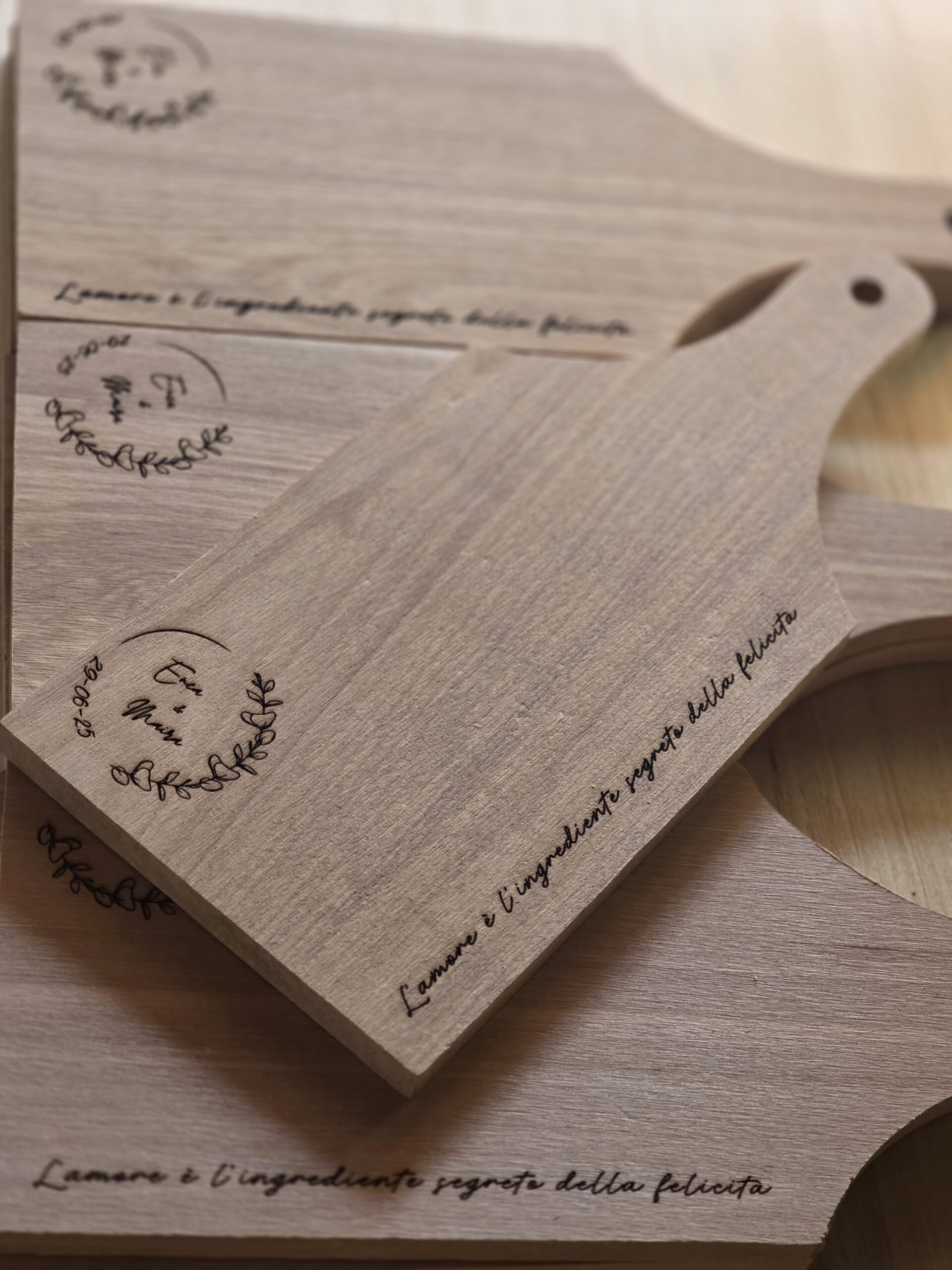Rendi unico il tuo regalo con un tagliere personalizzato in legno inciso con il testo che preferisci : nomi, date, frasi speciali o loghi aziendali.