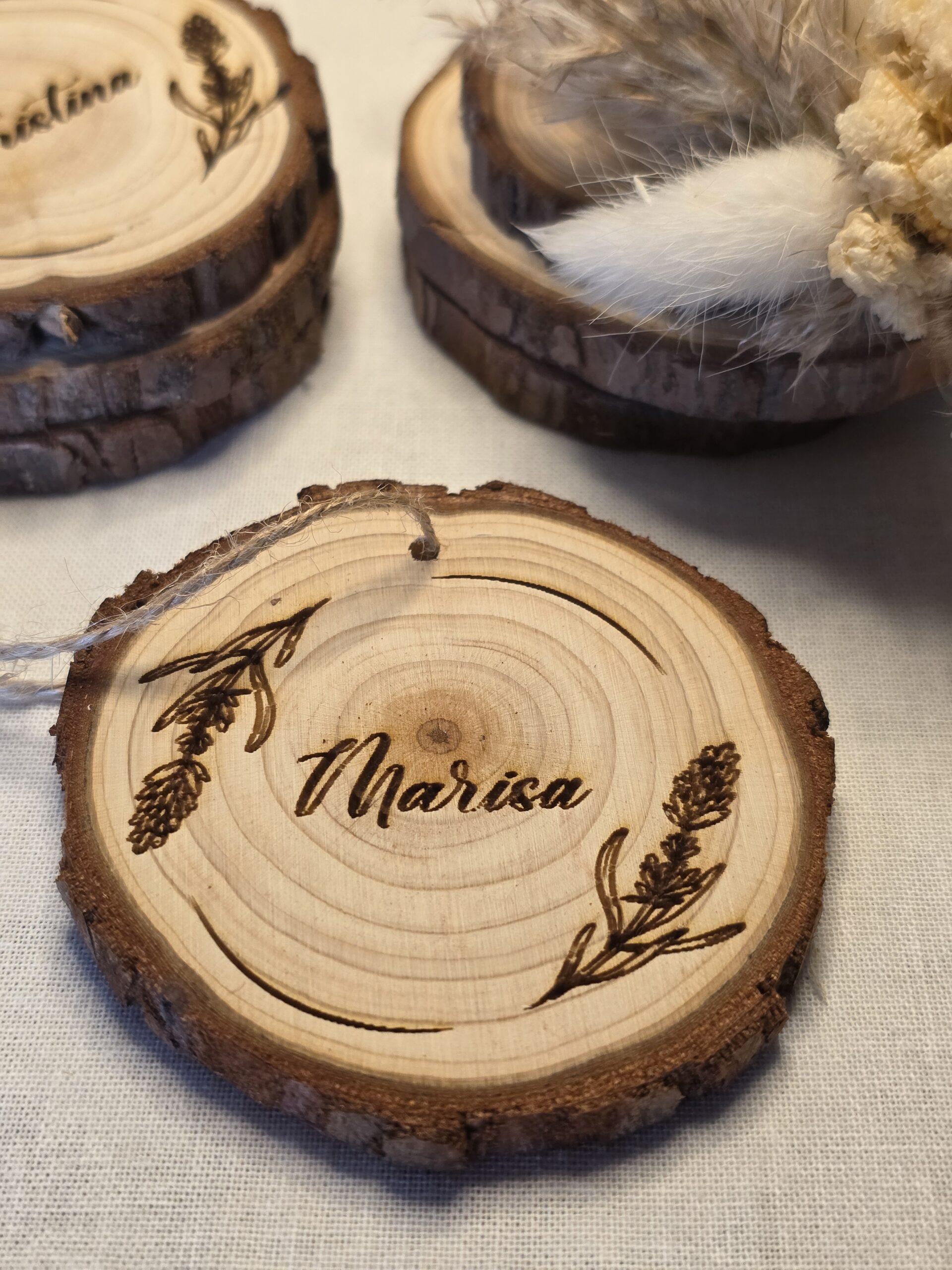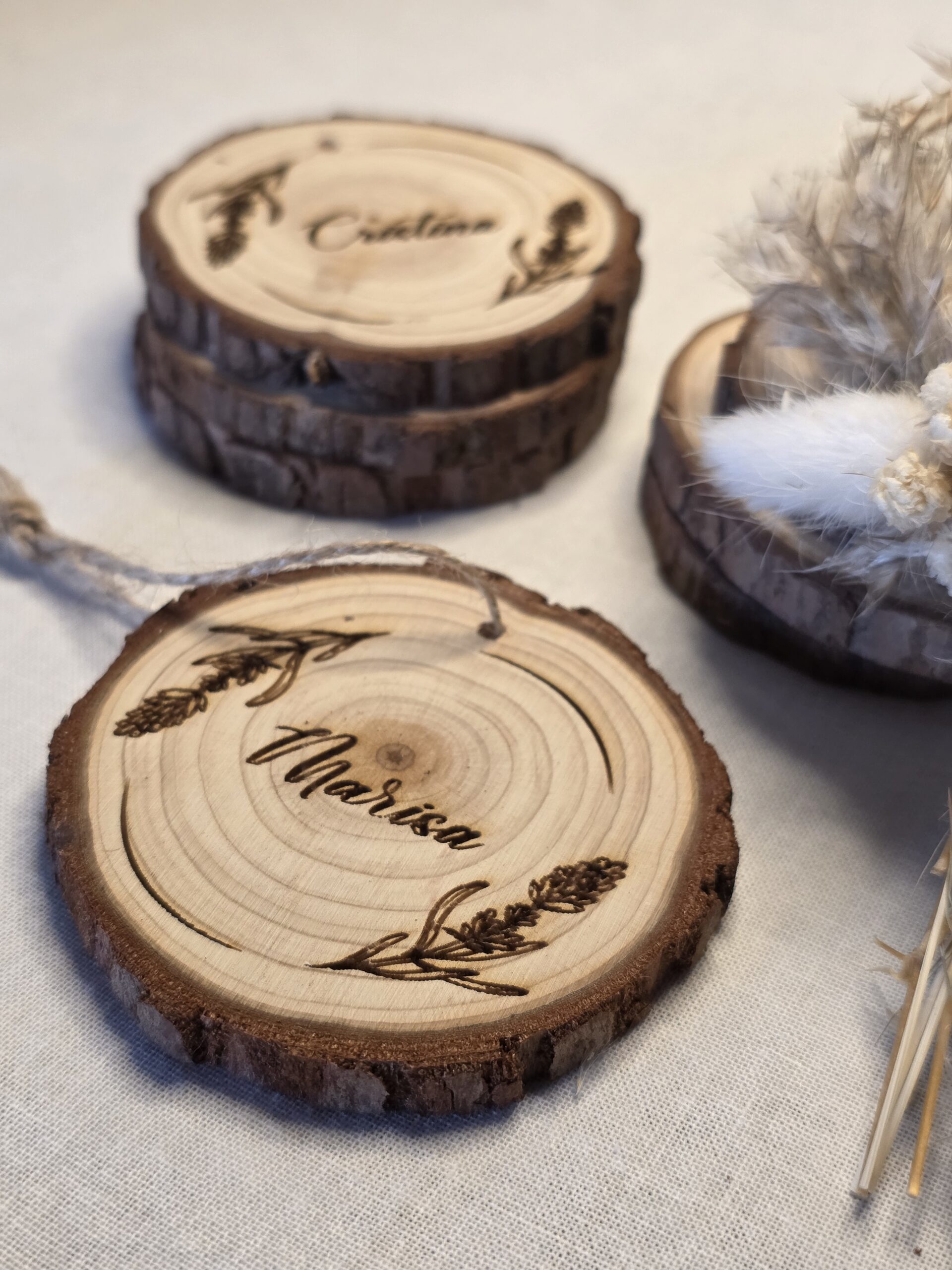 Rendi unico ogni evento con i nostri segnaposto in legno naturale, perfetti per matrimoni, battesimi, comunioni, cresime, feste ed eventi speciali. Ogni pezzo è realizzato a mano su dischetti di legno con corteccia, incisi a laser con il nome degli ospiti e, su richiesta, con grafiche o decorazioni personalizzate.